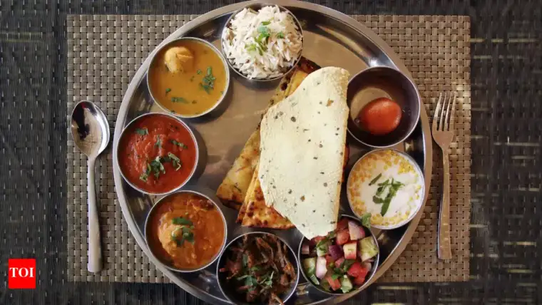 A balanced vegetarian platter with curries, rice, breads, and sides—Veg. Thali is a wholesome delight.